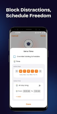 - Scheduled Blocking: Schedule specific times and days to automatically block selected apps and websites. Want to block Facebook on Chrome during work hours? Use our block site Google Chrome tool to enforce boundaries. Create custom screen time limit app rules for different parts of your day.