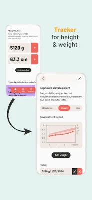 ✓ Tracker: keep an eye on your child’s growth using the size and weight tracker