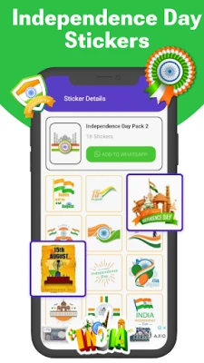 Independence Day Stickers include stickers like Independence text sticker, Indian flags stickes, Azadi stickers, Vande Matram stickers, Happy independence day wish stickers and many more.