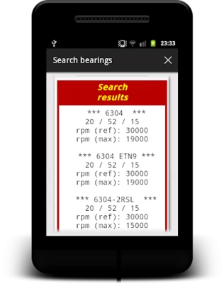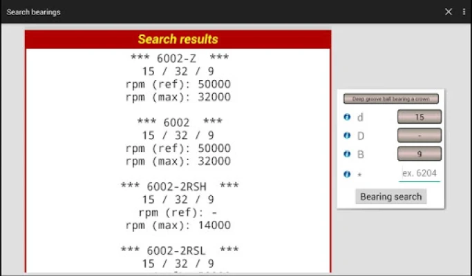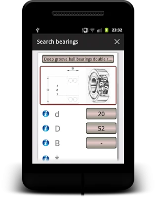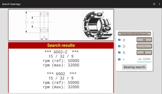 If you are a maintenance mechanic with this simple but useful app you will be able to search for bearings, having the measures, the type or the nomenclature.
