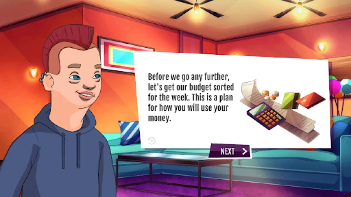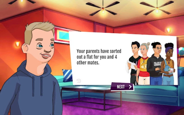 The game simulates what it could be like living in a flat with 4 flatmates. The player is presented with real-world scenarios and the choices they make may affect their budget, or their well-being.