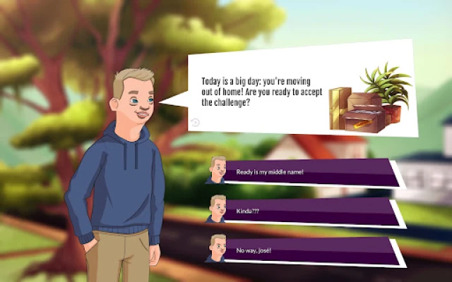 The game is supported by voice over and is rolled out as an ongoing story where the player is always faced with 3 possible choices for each scenario. Each game level has quests, including finding a job, learning to drive a car, finding new flatmates, etc. and more.