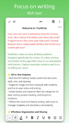 YesWriter is a fast, intuitive, and reliable writing and note-taking app that is easy to use with rich features. It is the essential tool for creating literary works, writing novels, brainstorming ideas, taking notes, managing to-do lists, recording personal thoughts, and pursuing artistic creativity.